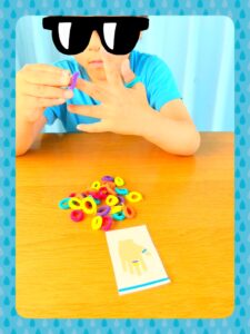 こちらは、お手本と同じ色のゴムを指にはめていく課題に取り組んでいます。