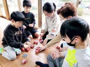 こちらは大人気のお手玉。触った時の感触や、ポンと投げて手に乗った時の感触が面白く、五感を刺激されて脳の活性化にもなるとか。みんなでコミュニケーションをとりながら、様々な遊び方で楽しんでいます🎶