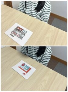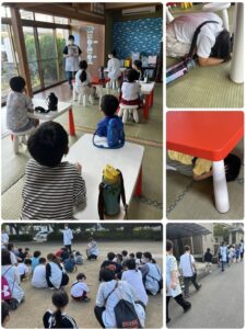 避難訓練のお約束『おかしもち』を確認し、机の下に隠れる動作や公園まで避難する流れを理解し、しっかり取り組むことができていました💮
