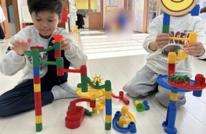 くみくみスロープを組み立てて玉が落ちていく様子を楽しんでいました。くみくみスロープは、玉が途中で止まってしまったり、予想していない所から落ちてきてしまったりするので、玉の流れを考えながら、組み立てなければいけません。遊びながら、思考力、想像力が養われるといわれています。楽しく遊んでいる姿を見て、お友達も一緒に遊び始め、お互いの玉の行方を見せ合いながら、楽しく遊びを共有をしていました。