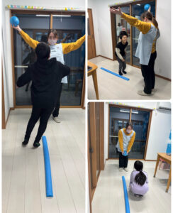 職員が手に持ったボールを、上下左右に動かします。ボールが動いた方向をよく見て、同じ方向にジャンプをする運動療育です。