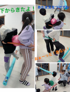 二人一組になり、背中合わせにボールを挟み、両手で棒を持ってボールを安定させます。職員が持っているプールスティックの動きをみて、足元にくるプールスティックを跨いだり、上を通るプールスティックに当たらないようにしゃがんだり、2人で声をかけ合いながら、1分間、背中に挟んだボールを落とさないように協力するゲームです。「次は足の方からくる。」「きたよ。上だ。」「せーので立とうね。」など、ペアになったお友達との会話が聞こえてきました。足元はスムーズにクリアできるペアがほとんどでしたが、しゃがんでから立ち上がる際、ボールを支えきれず、落としてしまうことも。。。それでも、みんな、楽しんで活動に参加できていました。
