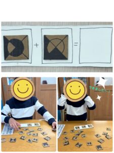 2つのパーツを合わせると、どのような完成図になるのかを考え、テーブルに広げてある様々な図形から、正解の1枚を探し出す課題に取り組みました。