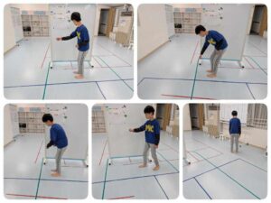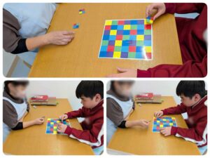 様々な色の組み合わせの中から、自分の持っている4色のタイルと一致する場所を見つけ出します。4つの色だけではなく、色の配置も揃えなければならないので、「見つけた!」と思っても「あれ?なんか違う」🤔とタイルの向きを変えたり、「右上は〇色で左上は〇色の場所」等と、よく見て考えながら見つけていました。🧐