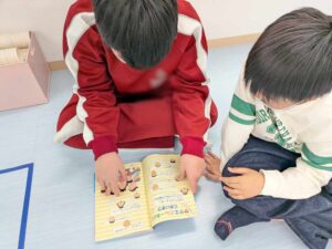 どこからか楽しそうな話し声と笑い声が聞こえてきたので、辺りを見回すと・・・ 👀  2人でニコニコしながら本を読んでいました📖 🎶 サザエさんのキャラクターの役になりきって、声のトーンを変えながら、セリフを仲良く交互に読み合わせしていました。😊🎶