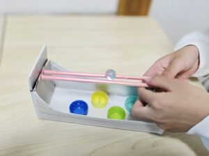 2本の棒を上手く操り、ねらった所にビー玉を落とすゲームです。