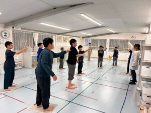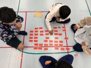 ある条件のもとジャンケンをし、新聞をたたんでいくゲーム。『あいこの時は新聞をたたむ』・『勝ったら新聞をたたむ』等、1回毎に条件を変えているので、必然的に説明に集中します!『条件を意識しながらジャンケンをし、自分は何を出したかを考えて新聞の操作をする』必要があるので、なかなか難しい😅。