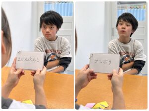 反対から読んだらどんな音になるか。一所懸命考えて言葉に出すことで、集中力を育むことができる課題です。アハ体験で、脳が活性化されますね!