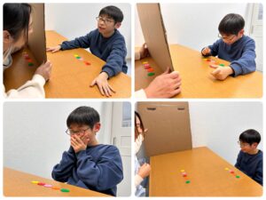 衝立のこちら側で、職員はディスクを並べお題をセット。反対側では好きなようにディスクを並べてスタンバイ。