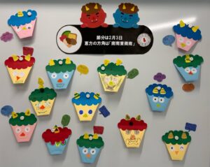 しっかり話を聞いて、製作完了!個性的な鬼ができました。『寝坊鬼』『朝、グダグダする鬼』『夜更かし鬼』『怒り鬼』『ゲーム鬼』etc…..是非とも追い出したい鬼が勢ぞろい💦。節分に豆をまいて、鬼を追い払ってくださいね!