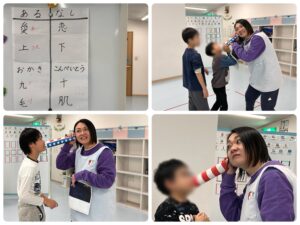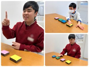 等、色々な課題を連続して出します。職員の出す指示をしっかり聞き、正確に理解して実行します。