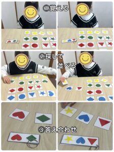4色5種(計20枚)のカードがあり、2個ver. 3個ver.の見本カードを7秒で覚え、探して順番通りに並べます。