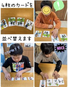 ・バラバラに並べられた4枚のカードを時系列に並べ替えてストーリーを作り、登場人物の気持ちやセリフを想像します。