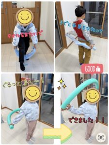 この療育では、自分では見る事のできない、背中側の感覚を養うことができると言われています。また、動きに合わせて手首や腕をひねる動作を行うため、日常生活動作をスムーズに行う練習にもなる運動療育です。