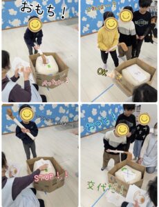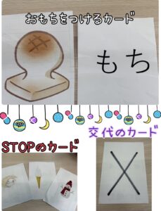 出された絵をよく見て【餅をつく・止まる・次の人と交代する】を繰り返し行うことで、瞬時の判断力、体幹、空間認識能力などの練習を目的に行いました。