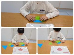 決められたパーツを使い、シルエットを見ながら同じ形に組み立てます△◇。空間認知能力・想像力・図形感覚・集中力・忍耐力・手先の器用さ等を養うことができる課題です✨。「あれ?これやったことあるんだけどな🤔。」等と記憶を辿りながら、パーツを回したり組み替えたりして完成させていました✨。問題が解けた時には達成感があり、自己肯定感にも繋がりますね😊。