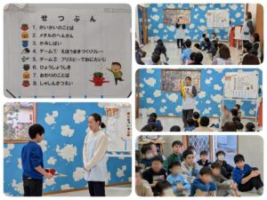 第3教室代表のお子さんが「今日も頑張ります。」と意気込みを言い、メダルを返還しました。その後は、紙芝居で豆まきと恵方巻きのお話です。皆さん、とても真剣に耳を傾けていました👂。
