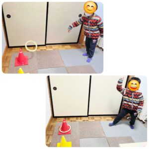 輪投げの主なねらいは、楽しみながら、「手と目の協調性(狙って投げる)」、「空間認知能力(距離感、力加減)」、「集中力」、「達成感」を養うことです。遊びを通して体幹の安定や、失敗してもやり直す諦めない心も育みます。