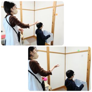 職員が後ろからカラーボールを壁にポンと当てます。そのボールを見て瞬時に判断し、ボックスを動かしてキャッチします。