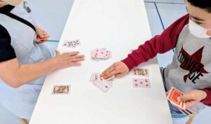 「先生トランプやりましょう!」と誘われて、お子さんと一緒にスピードを行いました🃏。スピードは、トランプを赤(♥️♦️)と黒(♠️♣️)に分け、中央の台札の数字に続くカードを、自分の前に並べた場札から出していき、手札を早く全部なくした人が勝ちというゲームです。
