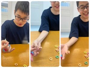 指定された指に片手でゴムをかけ、かけ終わったら外していく課題です✋。小指にゴムをかける作業は難しく、「あれ?おかしいな?」と失敗しながらも、指に神経を集中させ、最後まで諦めずに進めていました💮。