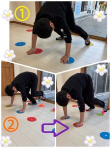 ①並べられたマーカーに手と足を乗せて、一つずつ、横に移動します。