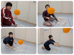 集中力・追視能力・空間認知能力・バランス感覚等の向上を目的として行いました。また、『風船を打つ』・『紙コップをひっくり返す』という2つの異なる動作を同時にこなす必要があるため、複数の指示を理解して実行する能力も鍛えられます✨。