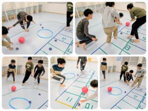 「あとちょっと!」「おしい!」「強すぎたー!」「お手玉どこ?」等と声を掛け合い、投げる角度や力加減を調整しながら、みんなで力を合わせて移動させていました️💪✨。同じ目標を持つことで自然と一致団結し、社会性も身につけることができます😊。