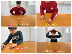 職員が並べたカードの配置を記憶し、衝立で隠された状態で自分の手元のカードを使って再現する課題です。