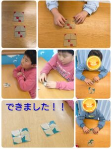 お手本の図柄をよく見ながら、カードをクルクル動かして、同じ図柄にすることができました。💮