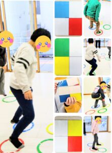 職員が出した色カードと、同じ色の輪にジャンプで移動する課題です。
