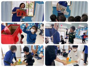 職員が背負っている2色のカゴの中に、同じ色の玉を入れていくゲームです。途中、カゴが動かなくなったらチャンスタイムです⏰。あちこちと移動するカゴを各自が全力で追いかけて入れていました🧺🏃💨。