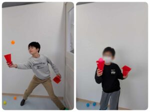 最初は、指示された方の手でキャッチする。次に、指示された方と逆の手でキャッチする。と、指示を変えながら行いました。