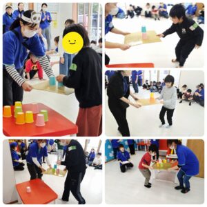 職員と組になり、紙コップタワーを運び、リレーでつなぎます。協力して気持ちを一つにし、
