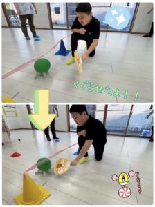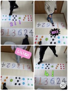 ① 職員側の床には1~6までの数字カードを置き、お子さん側には、サイコロの目が描かれたカードを置きます。