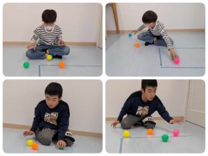 転がってくる4色のボールの中から、指示された2色のボールをキャッチする課題です。2色の指示を出すことで、動体視力・空間認識能力・集中力などに加え、2つの情報を覚えて左右の手を使い分ける練習にもなります。