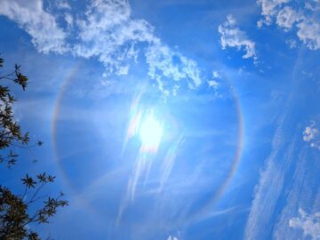 太陽の光が、薄い雲に含まれる水滴や氷の粒を回り込んで進む、「回折」という現象により発生します。昔から、見ると「良いことが起こる前触れ」と言われています😊。