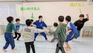 追いかける人は、急に方向転換をしたり、止まってみたり、様々な作戦を立てて動いています。守る人は、「こっち!」「今度はそっち」「待って、どこ?」など、どこをどう守れば良いか・相手の動きをどう止めるかを判断し、声を掛け合いながら協力して守っていました🤝🎶。
