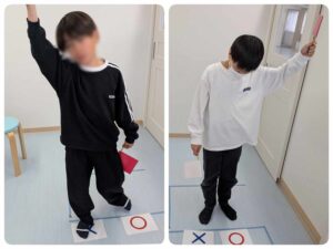 「白」と言われたら白い旗を上げる・再度「白」と言われたら白い旗を下げる。といった旗揚げゲームに、足元の〇と‪✕‬を追加した課題になります。足元は、「まる」と言われたら〇を踏む・再度「まる」と言われたら〇を踏んでいる足を外します。