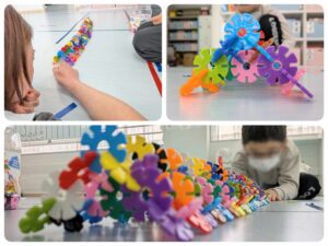 花のような形をした円盤パーツを繋ぎ合わせて、立体的な三角のパーツをたくさん作っていました。それを一直線に並べて長いトンネルを作ると、円盤パーツをおはじきのように指で弾いて、円盤パーツがトンネルの中をどこまで進めるか挑戦です🟡💨 。プレーしてみるとなかなか難しく、職員も真剣になっていました✨。